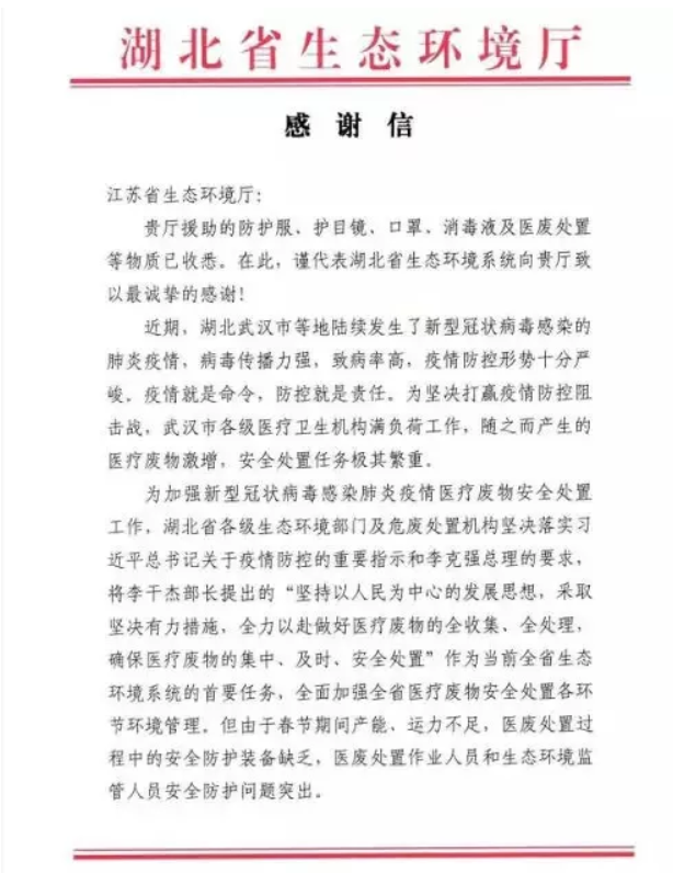 ? ?2月4日,江蘇省生態(tài)環(huán)境廳收到一封來(lái)自湖北省生態(tài)環(huán)境廳的感謝信,對(duì)其在“抗疫”關(guān)鍵時(shí)期雪中送炭捐贈(zèng)緊缺物資表示衷心感謝。