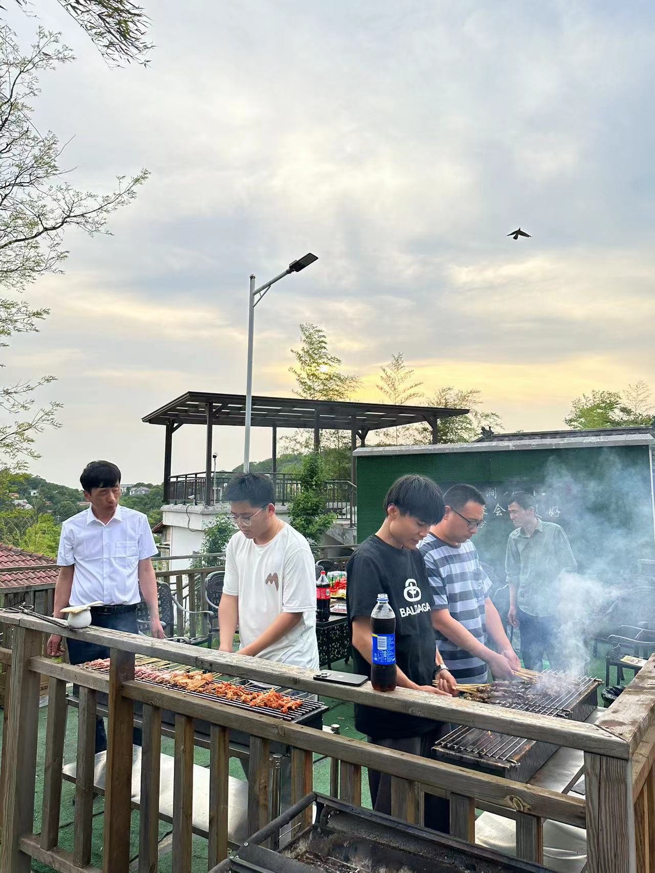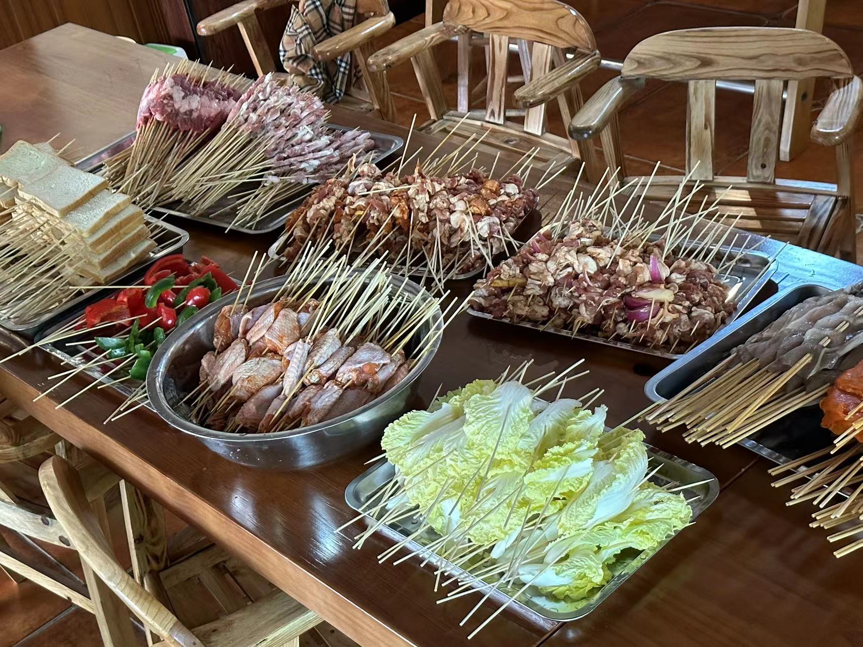傍晚時分,夕陽作伴,大家紛紛展示了自己的廚藝,串上肥瘦相間的五花肉、點燃炭火,開始了DIY燒烤。肉串在紅藍相間的火苗炙烤下滋滋作響,漸漸地由紅變白,最后變成焦黃色,香噴噴的,讓人垂涎欲滴。